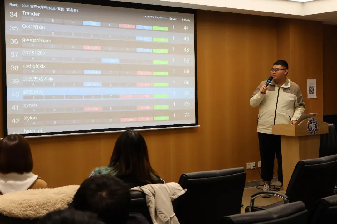 此外,本次比赛还设置了滚榜环节,由张圣皓同学负责滚榜,营造了紧张刺激的比赛氛围,也同时让参赛选手们体会到程序设计竞赛的魅力。