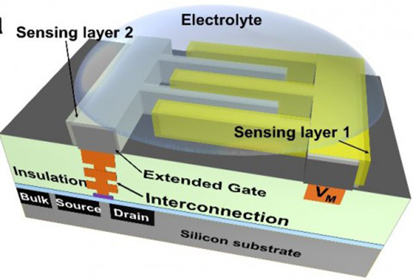 近日,微电子学院吴东平教授课题组开创性地提出了全固态无参比电极半导体离子传感器(REference-LEss Semiconductor Ion Sensor: RELESIS)。他通过测量一组正对差分敏感膜和待测溶液之间双电荷层的界面电势差来获得离子响应,待测溶液电势无需、也不会保持恒定,因此从源头上去除了对参比电极的需求。RELESIS的原型器件、工作原理、基本电路模型已经被相继验证,相关研究成果分别发表在2018和2019年的传感器领域国际期刊Sensors and Actuators B:Chemical上。