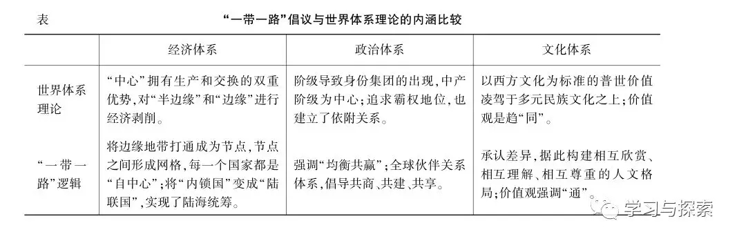 是否有成熟的理论可以概括“一带一路”的学理基础或逻辑,或者说“一带一路”的自身逻辑是否超越了以往的相关理论?对于这一问题的分析既需要逻辑也需要原理论。从内涵来看,“一带一路”是对沃勒斯坦的世界体系理论的超越。世界体系理论的逻辑是“中心—边缘”秩序,而“一带一路”的逻辑是“互利共赢”,即通过互联互通将边缘地带打通成为节点,节点之间形成网格,每一个国家都是“自中心”,由此国家在网格体系中实现公平与普惠(详见下表)。