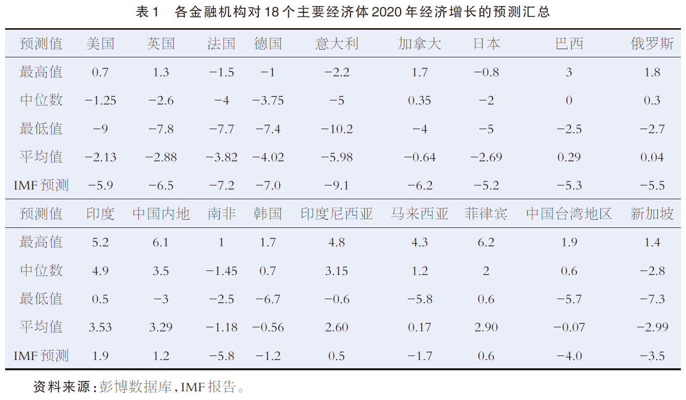 二是经济发展冲击。伴随着严峻的公共卫生形势,疫情对世界经济的打击很大,导致世界经济增长乏力,疫情负面冲击显著。2020年4月1日,联合国发布了《世界经济形势与展望》4月月度简报,分两种情况预测疫情对2020年全球经济的影响,2020年全球经济增长1.2%;最糟糕的情况下,全球经济衰退,增长率为-0.9%。国际货币基金组织(IMF)4月发布最新《世界经济展望》报告,认为全球经济2020年将收缩3%。彭博数据库汇总了截至3月26日各金融机构对全球主要国家经济增长的预测。其中,美国经济增长预测的中位数(平均数)是-1.25%(-2.13%),德国经济增长预测中位数(平均数)是-3.25%(-4.02%),中国经济增长预测中位数(平均数)是3.5%(3.29%),日本经济增长预测中位数(平均数)是-2%(-2.69%)。总体上,各金融机构预测2020年各主要经济体,特别是欧美日等发达国家,经济衰退概率非常高。