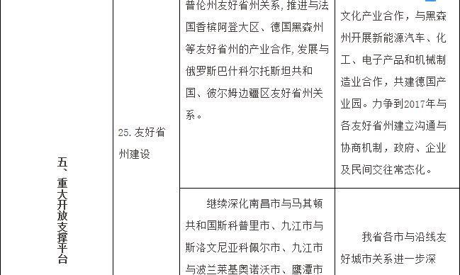 (二十八)发展友好省州。积极推动与沿线重点地区建立友好合作关系,着力巩固我省与菲律宾、柬埔寨、俄罗斯、匈牙利、德国、法国等国家8对友好省州关系,密切南昌、九江、宜春、上饶、鹰潭等与沿线地区6对友好城市关系,争取所有设区市在沿线国家发展友好城市。务实推进友好省州(城市)合作,倡导在平等互利基础上签署合作框架协议,开展高层互访、互办经贸推介等活动,促进政府、企业以及民间交往常态化,推动双边合作项目有效实施。充分利用好长江中上游地区与俄罗斯伏尔加河沿岸联邦区合作机制,务实推进我省与巴什科尔托斯坦共和国、彼尔姆边疆区等地区的合作交往。
