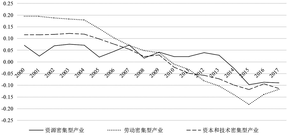 为进一步定量揭示中欧产业竞争差距的变动特征,本文在Ales测度比较优势变动幅度方法的基础上,测度2000~2017年及金融危机前后中欧产业差距年均变动步幅(见表2)。2000~2017年中欧产业差距在SITC2(非食用原料)和SITC3(矿物原料、润滑油及有关原料)两个产业呈扩大趋势,但危机后时段呈现出缩小态势。值得注意的是,除SITC4(动植物油脂及蜡)和SITC8 (杂项制品)两个产业外,中欧产业差距均呈现出金融危机后差距缩小更快的现象,这主要是因为中国等发展中国家在危机中所受的冲击低于发达国家,而危机后的全球需求萎缩,特别是紧随金融危机后的欧债危机,对欧盟尤其是欧元区国家打击则尤为严重,经济遭受重创,复苏缓慢乏力,进而加剧了中欧产业差距的缩小速度。