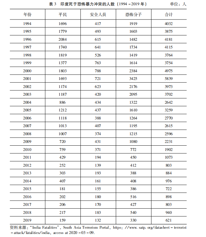 南亚虽是恐怖主义形势比较严峻的地区,但近年来出现明显缓和。尤其是印度和巴基斯坦两个国家,曾经都面临非常严峻的恐怖主义威胁,但近年来安全形势大为缓和。阿富汗的恐怖主义形势比较特别,在稳定多年以后又呈上升趋势。斯里兰卡则突发新型恐怖袭击事件,但未来安全形势也并不太悲观。印度曾是世界上恐怖主义威胁最为严重的国家之一。在20世纪90年代后期,印度曾面临非常严峻的恐怖主义威胁。但数据显示,印度目前已经基本摆脱了恐怖主义问题的困扰(见表3)。恐怖主义威胁已经从一个国家安全问题,下降成为 一个社会治安问题。但在2019年,由于印巴关系紧张以及印度国内政治变化,印度的政治暴力活动有上升趋势。2019年,印度共发生了23570起政治暴力事 件和抗议活动,造成1520人死亡。