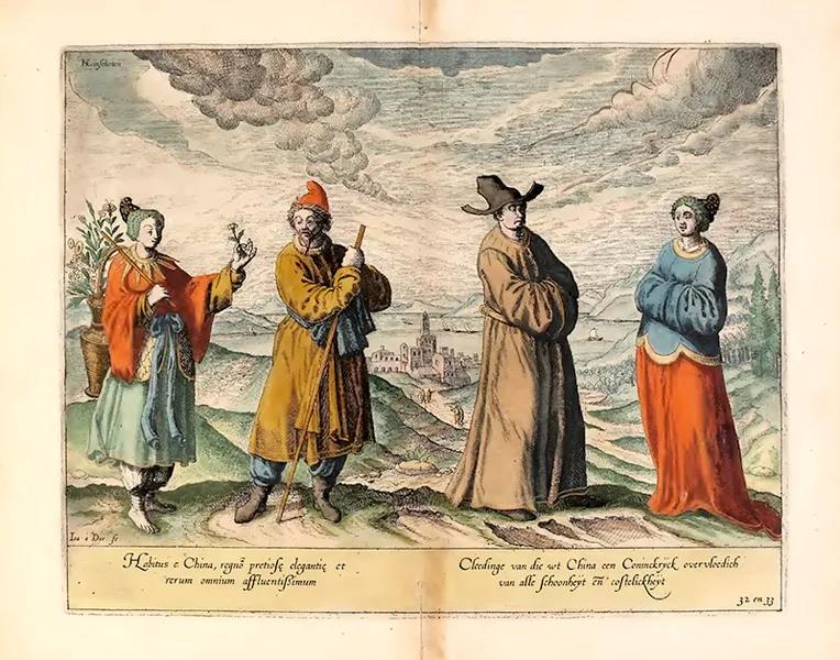 荷兰人林旭登(Jan Huyghen van Linschoten)在1595年出版的《葡属印度水路志》(O Itinerário, Viagem ou Navegação para as Índias Orientais ou Portuguesas)中绘画的中国人(图片来源:chiculture.org.hk)