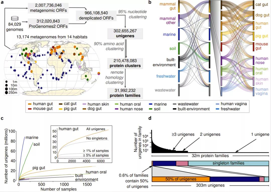 从1.3万个宏基因组样本和近10万个细菌基因组中构建的包含3亿个原核生物基因的全球微生物基因目录。(a) 全球微生物基因目录构建流程;(b)不同栖息地之间的unigenes的共享;(c)unigene累计曲线;(d)unigenes 数量的分布