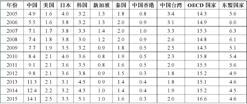 注:本表引用的是OECE TiVA数据库中的DEXFVAPSH(Foreign value added share of gross exports,by value added origin country)指标,数据代表在越南的出口额中,各经济体所创造的比重,比重越大,说明该经济体对越南出口的中间产品越多,在越南的后向关联中的地位越高。表中选取的经济体是当前越南的主要贸易伙伴。