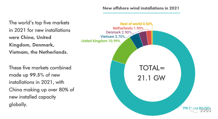 全球海上风电在2021年实现了21.1GW的新增并网(为2020年的三倍多),创造了历史最好成绩。中国一枝独秀,其海上风电增量占全球的80%,这也让中国超越英国成为全球海上风电累计装机最多的国家。