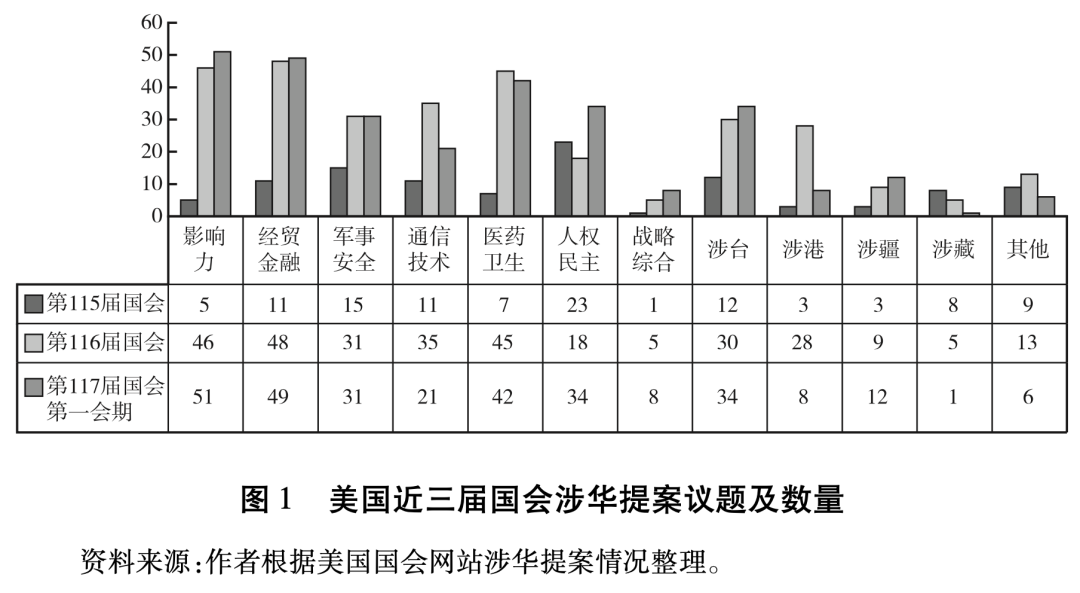 从近三届国会涉华提案的具体内容看,主要有五方面的特点。一是提案数量大幅增加,对华攻势升级。第115届国会共提出108项涉华议案(月均4.5项),相关立法活动不算频繁,这在很大程度上与特朗普政府执政初期两党专注于废除奥巴马医改和减税改革的斗争有关。进入2020年大选周期后,在特朗普政府加大对华遏制与打压的背景下,第116届国会涉华提案迅速增至313项(月均13项),与第115届相比翻了近两番,立法数量及频度均创21世纪以来的新高。及至第117届国会,在第一会期内已提出297项涉华提案(月均24.8项),数量分别是第115届和第116届国会同期的4.8倍和2.7倍。而且,2021年国会仅有283个工作日,是2014年以来最短的一年,这充分显示出本届国会涉华立法增量巨大。在拜登就职次月,国会共提出45项涉华议案,创造了单月涉华提案的最高纪录。仅在2020年2月18日,就有11位议员提出共20项涉华议案,内容涵盖多个方面。从提案来源看,参众两院的提案数量分别是114项和183项,占比分别是38.4%和61.6%,这一比例与前两届国会相近,体现了众议院作为美国国会立法倡议主体的地位。从提案类型看,第117届国会更倾向于推出有法律约束力的立法(议案和共同决议案),而非象征性较强、旨在表达国会意见的提案(决议案和联合决议案)。前者有256项,占总提案数的86.2%,比例略低于第116届国会的87.2%,但远高于第115届国会的74.1%。尽管显著加大介入对华事务,但本届国会的立法效率并不尽如人意,仅有两项提案获两院通过并经拜登签署生效,而前两届国会共有20项提案生效(详情如表1所示)。鉴于本届国会会期还未结束,后续立法议程是否会加快推进仍有待观察。