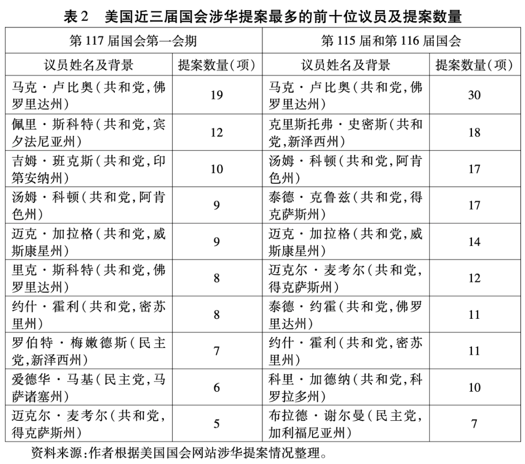 二是共和党把控议程,核心议员作用突出。在第117届国会中,共和党议员共提出229项涉华提案,占相关提案总数的77.1%,民主党议员共提出68项议案,数量不到共和党议员提案的1/3,这一比例与前两届国会的相关数据接近,体现出共和党人倡导涉华提案议程的主动性。从发起人的身份看,提出三项及以上提案的议员有31人,其中共和党有25人,占比超过八成。在涉华提案数量排名前十的议员中仅有两名是民主党人(详情如表2所示)。根据“美国保守派联盟”(American Conservation Union)的评分,提案数量排名前十位中的共和党议员的平均得分超过87%,被归入“保守成就奖”(Award for Conservative Achievement)一类,明显高于参众两院共和党人的79%和74%,这表明共和党保守派是美国对华示强的急先锋和主力军。其中,佛罗里达州共和党参议员马克·卢比奥(Marco Rubio)连续多届成为发起涉华提案最多的国会议员,在第117届国会第一会期提出19项涉华提案,月均1.58项,远高于他前两届国会任期的月均0.63项的提案数量。