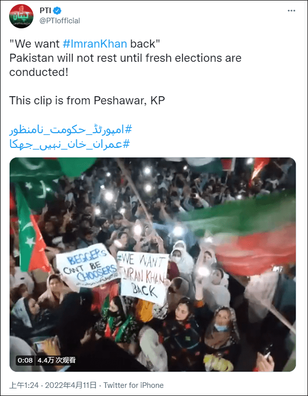 4月11日,正义运动党在推特上分享了来自巴基斯坦国内的伊斯兰堡、巴沙瓦、米扬瓦利等城市以及海外的迪拜、伦敦等城市的巴基斯坦人的示威画面,并写道:任何一个有着自由的巴基斯坦人的地方,“进口政府”都绝不会被接受。