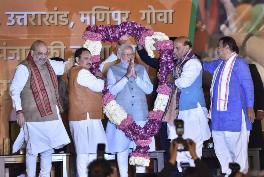 2022年3月,印度人民党在北方邦选举中以绝对优势获得连任。图为印度总理莫迪(中)及其政府核心人员在庆祝选举胜利。