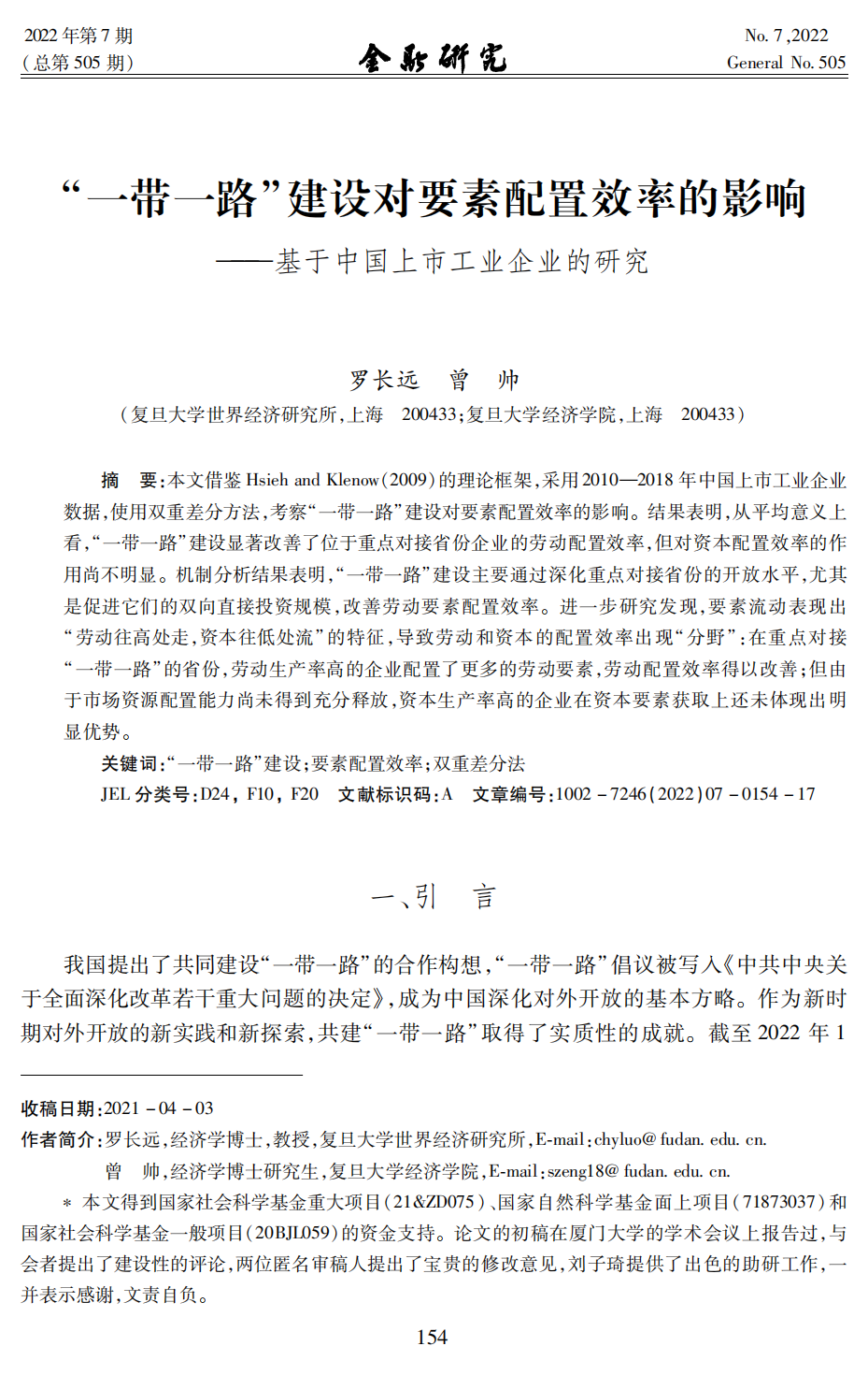 罗长远 曾帅:“一带一路”建设对要素配置效率的影响 ———基于中国上市工业企业的研究