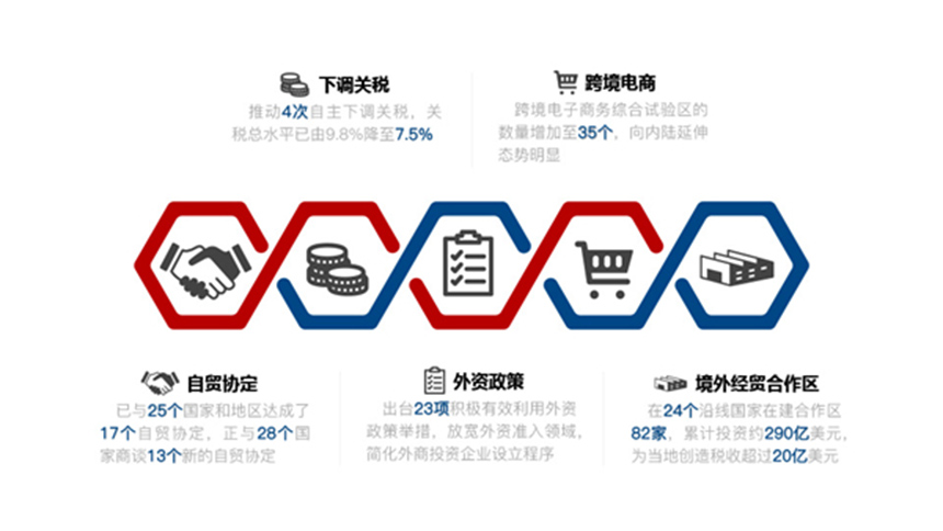 这一方面有赖于中国贸易自由化便利化水平进一步提升。今年,商务部落实世贸组织《贸易便利化协定》,推动4次自主下调关税,降低了包括医药品、日用消费品、汽车和工业品的关税,关税总水平已由9.8%降至7.5%。与中东欧国家达成服务贸易合作倡议,与多个国家签署服务贸易合作文件,多双边服务贸易促进平台更加完善。