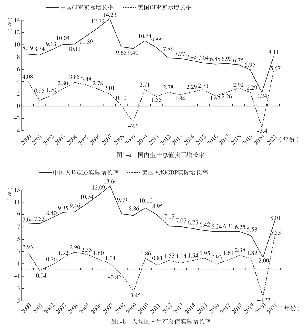 图12000—2021 年中美国内生产总值与人均国内生产总值实际增长率