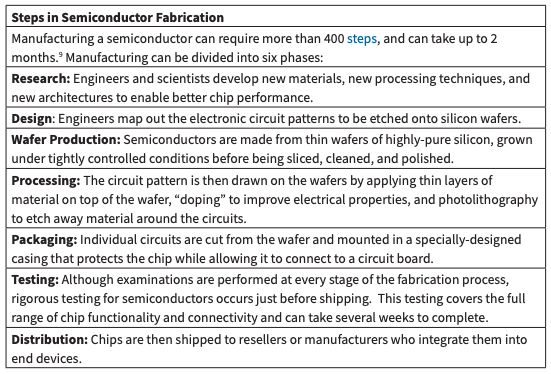 上表描述了半导体生产的步骤。制造一个半导体需要 400 多个步骤,超过 2 个月的时间。制造过程可分为 6 个阶段:研究、设计、晶圆生产、加工、封装、测试。