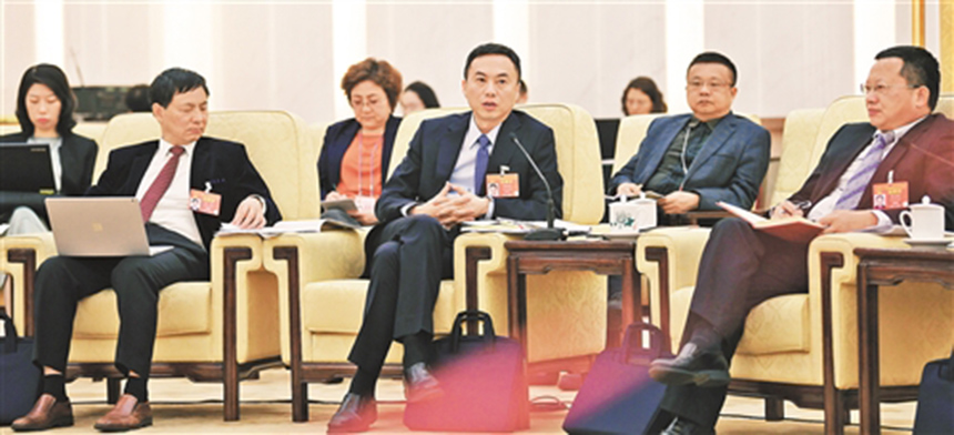 3月9日,全国政协科技界在驻地举行小组会议,讨论外商投资法草案。全国政协委员沈南鹏(左二)认为,外商投资法将对新一轮高水平对外开放起到重要作用。(图片来源:经济日报 高兴贵摄)