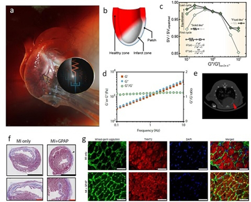 研究显示,GPAP黏附在心脏表面后能显著降低梗死区域心肌的弛豫常数到与非梗死区域几乎一致的水平。GPAP可以长期贴附在心外膜表面,无毒副作用,并可以直接通过CT进行连续动态追踪。通过构建大鼠的急性心梗和亚急性心梗模型,研究证实心梗后的病理性左室重构在使用GPAP后得到延缓和逆转,心功能的主要指标全部得到改善,病理性心肌重构得到减轻,治疗效果超越了几乎所有目前已报道的不含细胞的心肌补片类型甚至部分干细胞补片。