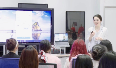 图4. 沈玢老师(站立者)点评广告学概论学生作品