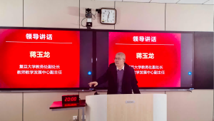 复选赛前校教务处、工会领导发言,感谢评委们对校赛各阶段工作的支持,鼓励选手以竞赛为契机,不断提升日常教学水平并展示复旦青年教师的风采。