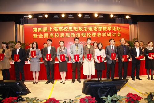 会上,还表彰了第一届上海高校思想政治理论课教学比赛获奖教师,四位教学比赛一等奖获得者分别做了15分钟的现场教学展示。会上,市委副秘书长姚海同还为第三批思政课名师工作室授牌。