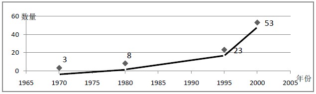 图 1 英国高校教师发展中心的数量变化(1970-2000)