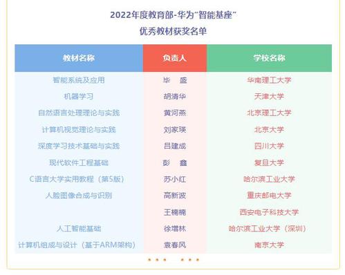 2020年9月,在教育部的领导下,华为与72所高校布局建设首批“智能基座”产教融合协同育人基地,以鲲鹏、昇腾等根技术为核心构建多样性的计算产业和人才生态,为我国信息技术产业高质量发展提供人才支撑。为了表彰优秀,鼓励更多的教师参与教学资源建设,共同丰富教学内容,构建完备的“智能基座”课程和教材体系,教育部-华为“智能基座”联合工作组决定实施“智能基座”优秀教学资源奖励计划,对教材和在线课程等优秀教学资源进行表彰。 经过高校教师自主申报、专家评审遴选等一系列程序,最终评选出10种“智能基座”优秀教材和15门“智能基座”优秀在线课程,入选首届教育部-华为“智能基座”优秀教学资源奖励计划。