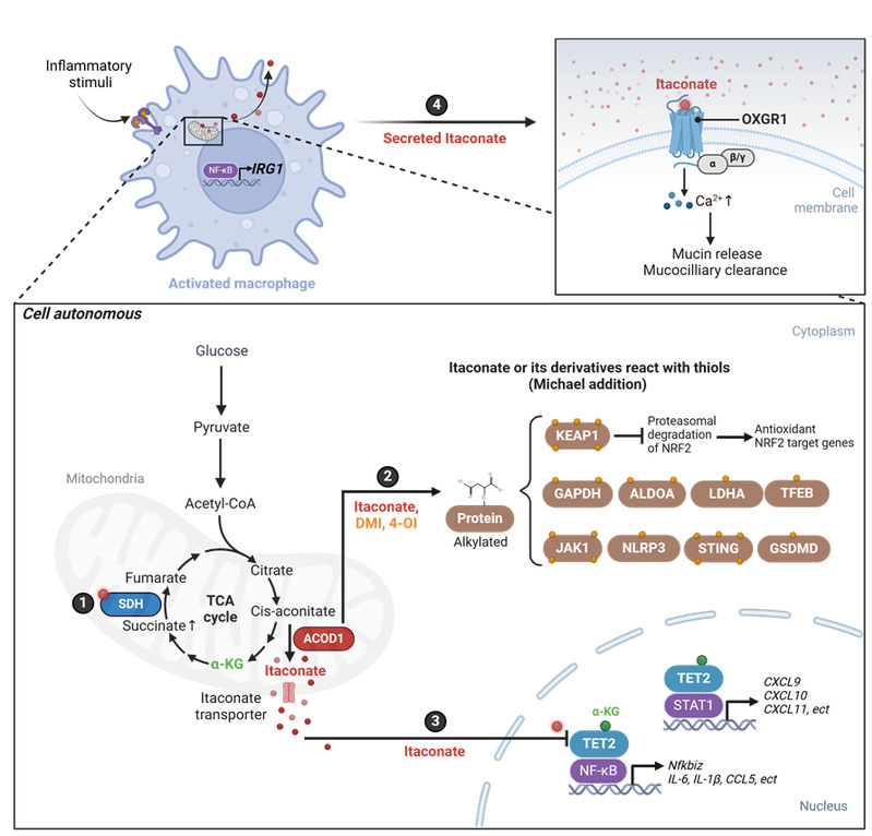 图1.免疫代谢物衣康酸的合成途径和作用机制。研究②衣康酸共价修饰蛋白质,多采用衣康酸衍生物—如衣康酸二甲酯(DMI)和4-辛基衣康酸(4-OI)。上述衍生物与天然的衣康酸相比,亲电性等化学性质不同,应避免混用所带来的可能误导。