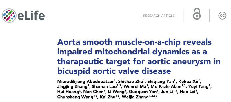 2021年9月6日,我院张炜佳团队与中山医院王春生/朱铠团队合作,在eLife发表了题为Aorta smooth muscle-on-a-chip reveals impaired mitochondrial dynamics as a therapeutic target for aortic aneurysm in bicuspid aortic valve disease的研究性文章。同时,该论文被遴选为“eLife digest”科学文摘评述报道。该研究揭示了在心率周期性张应力下,主动脉平滑肌细胞NOTCH1表达不足加剧线粒体分裂―融合平衡往分裂状态转移,进而促进细胞损伤及凋亡,最终引起主动脉血管扩张病变的过程。此外,还验证和探讨了靶向线粒体融合-分裂失衡的“老药”用于新适应症的可行性。