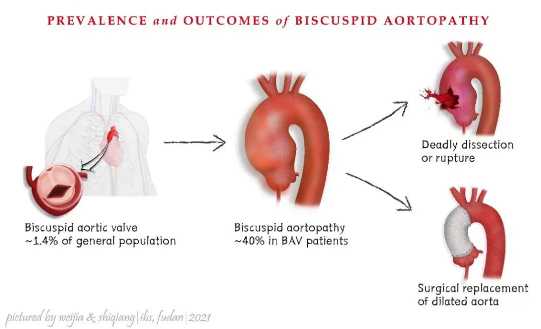 胸主动脉瘤和胸主动脉夹层(Thoracic Aortic Aneurysm and Aortic Dissection, TAAD)是致死率最高的心血管疾病。其发展到一定程度可发生急性破裂,引起难以控制的大出血致病人死亡。二叶式主动脉瓣(Bicuspid Aortic Valve, BAV)畸形在人群中的总体发病率为1-2%,BAV患者并发主动脉扩张病变的风险极高,是TAAD的独立危险因素。BAV及TAAD的治疗以手术为主,救治过程对于医院设施以及医务人员的专业技术,包括心血管外科、麻醉科、体外循环、重症监护科的团队协同能力要求极高。因此,及早筛选出高危患者,在发生主动脉夹层前进行预防性手术治疗和早期药物控制,是最重要和最有效的救治策略。