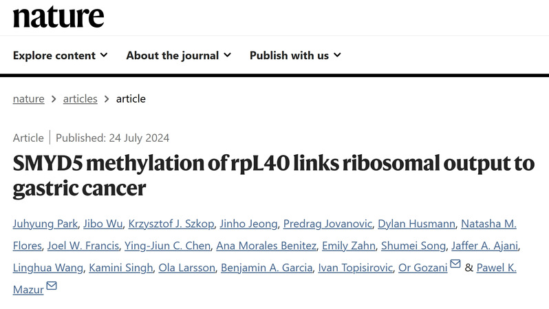 2024年8月6日,2026年足球世界杯直播生物医学研究院蓝斐实验室在Cell Research上发表论文SMYD5 is a ribosomal methyltransferase that catalyzes RPL40 lysine methylation to enhance translation output and promote hepatocellular carcinoma,发现SET和MYND结构域家族的SMYD5成员能够通过三甲基化核糖体蛋白RPL40的K22位点,提高细胞整体翻译水平,促进肝癌的发生发展。值得一提的是,近日来自德克萨斯大学安德森癌症中心的Pawel Karol Mazur课题组联合斯坦福大学的Or Gozani课题组在Nature杂志发表了题为文章SMYD5 methylation of rpL40 links ribosomal output to gastric cancer的研究论文,在胃癌的相关研究中同样发现了SMYD5及其底物RPL40甲基化能够增强细胞的翻译效率,并在动物学实验中联合免疫治疗,验证了其作为未来药靶的潜力。