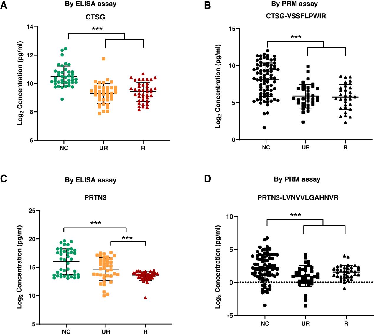 最后,作者在包括 40R、 40UR以及 40 名健康对照的额外队列 (III) 中使用 ELISA 进一步验证了两种低丰度蛋白 PRTN3(源于组织蛋白组)和 CTSG(源于血清蛋白组),显示了与 PRM高度一致的结果(图4)。