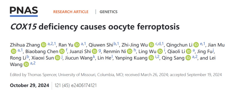 PNAS丨王磊/桑庆团队与合作者发现线粒体呼吸链蛋白COX15缺陷诱导铁死亡导致人卵退化