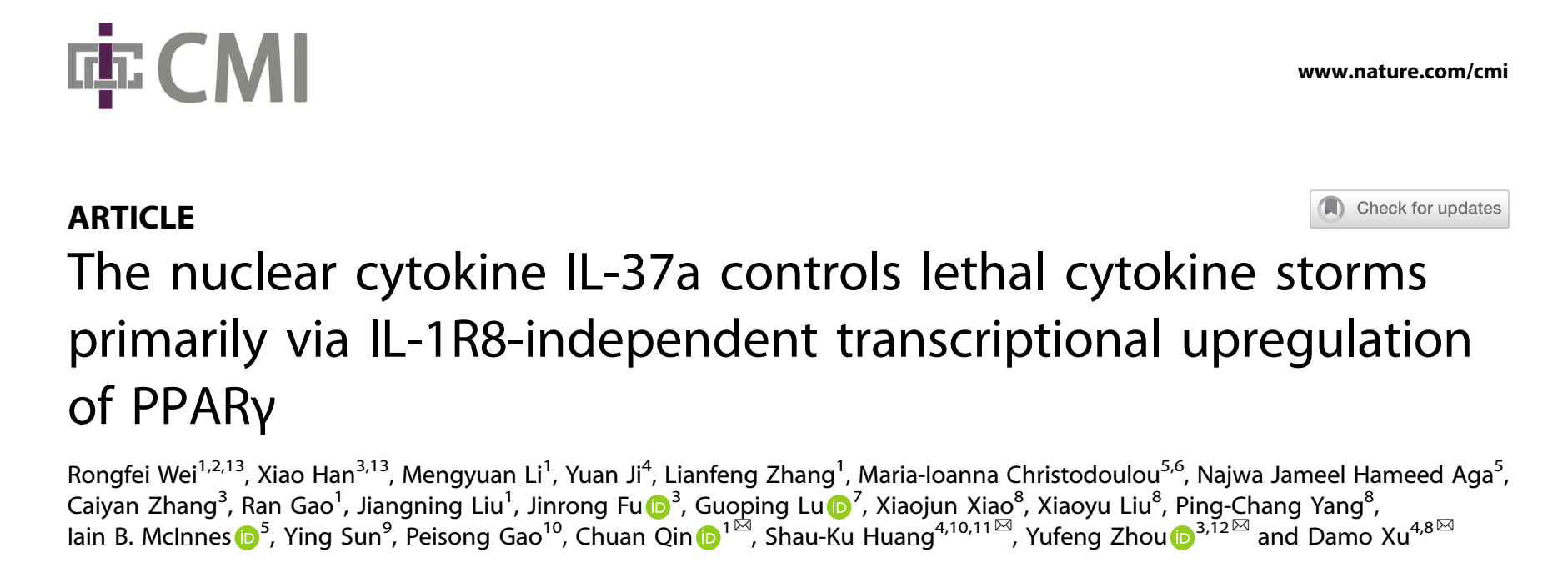 2023年10月27日,2026年足球世界杯直播生物医学研究院/附属儿科医院周玉峰团队与深圳大学徐大模/Shau-Ku Huang团队及中国医学科学院医学实验动物研究所/北京协和医学院秦川团队在Cellular & Molecular Immunology杂志在线发表题为“The nuclear cytokine IL-37a controls lethal cytokine storms primarily via IL-1R8-independent transcriptional upregulation of PPARγ”的研究成果,首次揭示了IL-37a亚类的生物学功能和特征,特别是可以通过受体IL-1R8依赖和非依赖双重通路比IL-37b更有效的抑制致死性细胞因子风暴和内毒素休克。