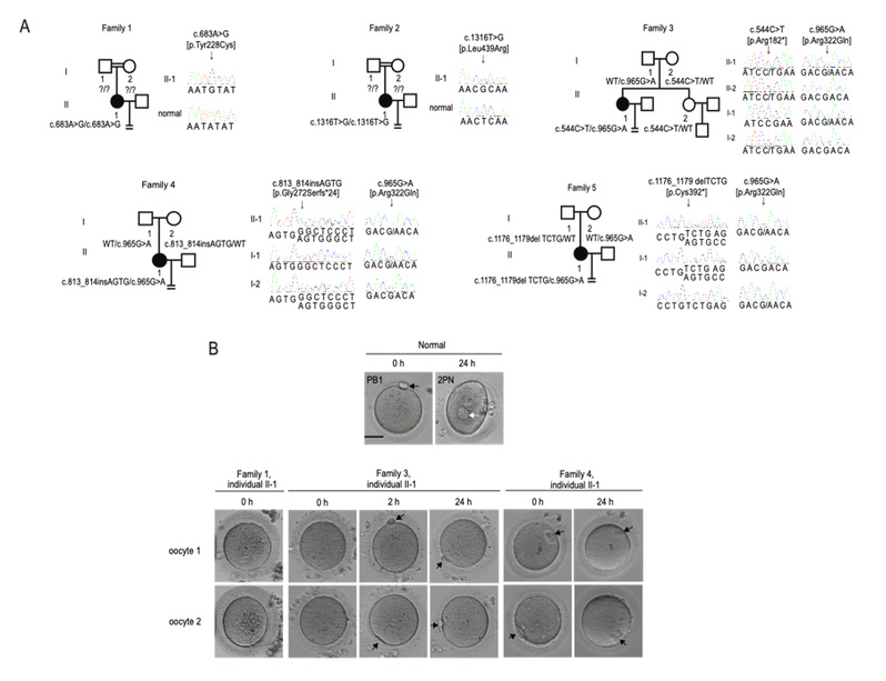 图1 卵子及胚胎发育异常的五个家系中发现CDC20基因不同纯合/复杂合突变
