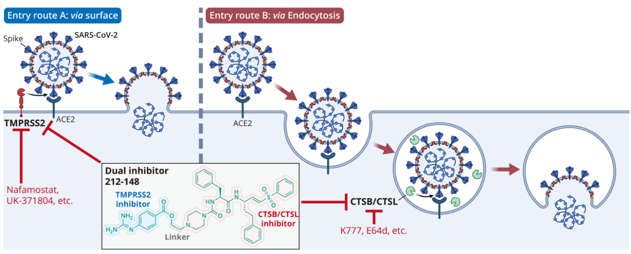 新冠病毒在入侵过程中,既能通过质膜融合直接入侵(见下图左,途径A),也能在细胞内吞途径中完成膜融合(见下图右,途径B),释放病毒基因组。在两条入侵通路中,膜融合过程的发生分别需要依赖TMPRSS2和CTSB/CTSL对病毒刺突蛋白进行切割并激活其构象,从而介导后续的膜融合反应。由于宿主蛋白酶在新冠病毒的入侵过程中不可或缺的重要地位及其作为宿主蛋白相较于病毒蛋白保守性高,不易突变的特性,被认为是抗新冠病毒广谱性药物开发的理想靶点。