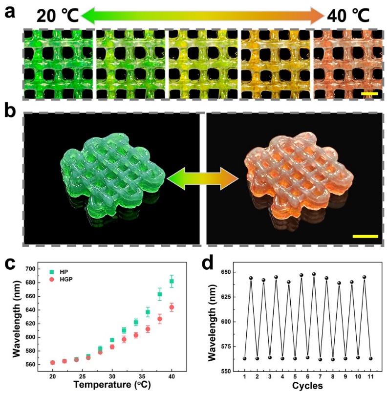 上述光学和流变特性确保了HGP墨水可以通过直接打印进行形状加工。因此,该工作进一步地构建了一个由位移式3D打印机、紫外光源和蠕动泵组成的3D打印平台。将HGP墨水吸取入注射器,可以在蠕动泵的推动下通过3D打印机的喷嘴打印到任意部位,再通过紫外光进行聚合,赋予HGP墨水结构色并将其结构完全固定。利用这一技术,该工作展示了各种不同颜色的2D和3D结构色模型,并采用不同配比的HGP墨水展示了加工多色3D模型的能力。由于HPC和PACA都具有温度响应性,这些结构色3D打印模型具有温度传感的特性,能够根据环境温度的变化产生颜色的偏移。