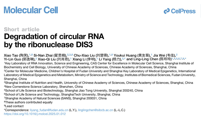Mol Cell | 杨力课题组与合作者发现核酸内切酶DIS3介导的环形RNA降解机制