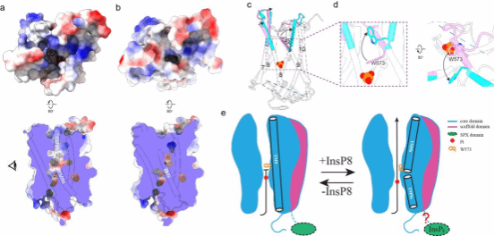 Within the core domain, the transmembrane helices (TMs) form a barrel-like architecture, creating a continuous ion translocation pathway. At the narrowest point of this pathway, located near the cytoplasmic side at its center, a phosphate (Pi) binding site is formed. This site effectively divides the pathway into an intracellular vestibule (IV) and an extracellular vestibule (EV). Studies indicate that impaired PP-InsP synthesis correlates with reduced Pi export levels in animal cells, suggesting that XPR1 activity may be activated by PP-InsP binding. Consistent with this hypothesis, structural analysis reveals that the extracellular vestibule (EV) in the PP-InsP binding site mutant XPR13mut is in a closed state, whereas the EV in the wild-type XPR1WT is in an open state. This conformational change is primarily due to structural rearrangements in TM9 and the side chain of residue W573. Collectively, these structural findings suggest that XPR1 functions via a mechanism more akin to an ion channel.