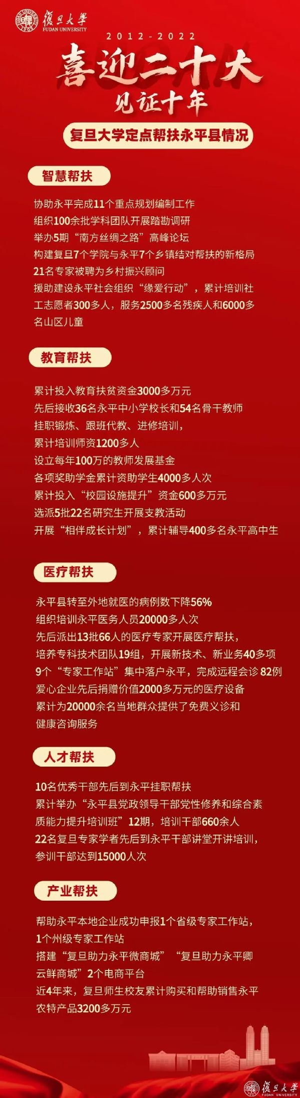一所高校,一座县城,一份情谊,绵延十年。这些复旦挂职干部,见证了学校党委对定点扶贫和乡村振兴工作的重视,见证了一批又一批复旦人的全情付出,也将复旦人与永平人的深情厚谊镌刻心间。