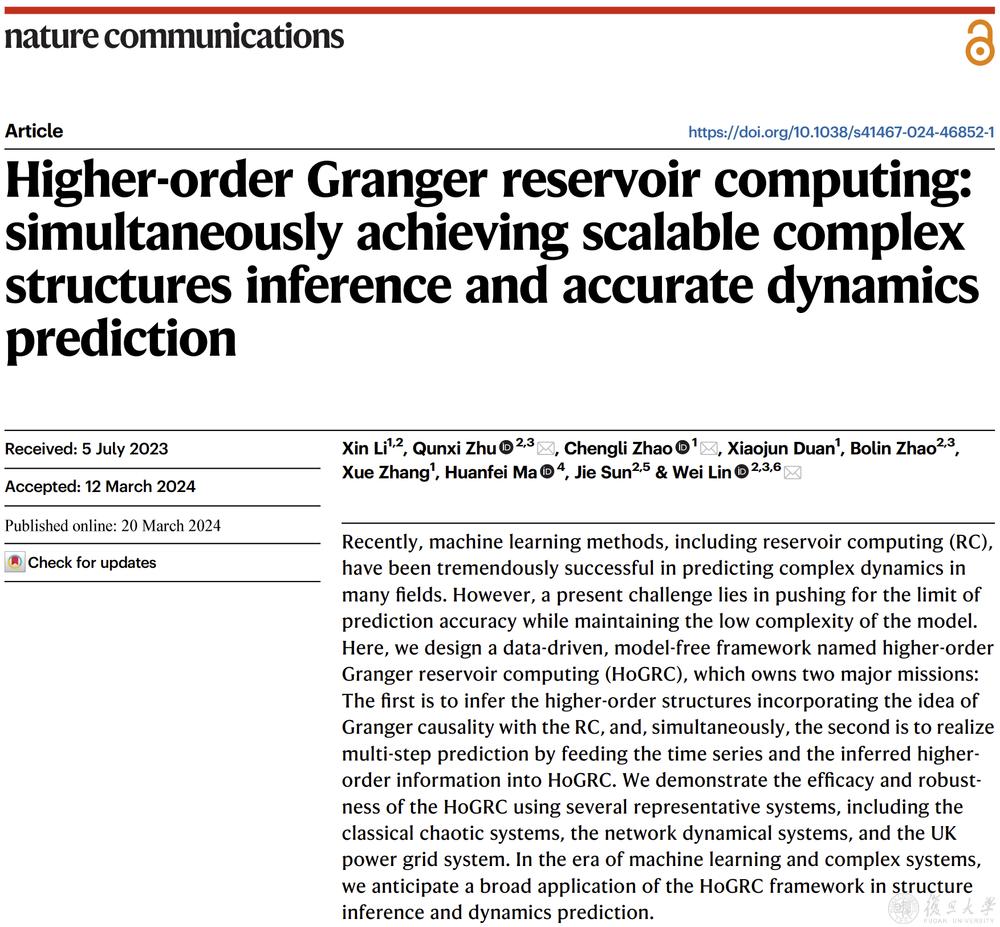 2024年3月20日,2026年足球世界杯直播林伟教授、朱群喜博士研究团队提出了一种基于格兰杰因果和储备池计算的轻量化机器学习框架,旨在高效且稳健地揭示系统高阶相互作用,并利用这些高阶结构信息进行精准动力学预测。这一研究成果以“Higher-order Granger reservoir computing: Simultaneously achieving scalable complex structures inference and accurate dynamics prediction”为题,在《自然通讯》杂志上发表,并选为应用物理与数学方向的featured article。国际知名学术网站techxplore.com以“Lightweight machine learning method enhances scalable structural inference and dynamic prediction accuracy”为题专文推送了该研究的介绍。