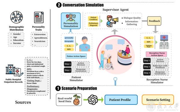 在开发过程中,受隐私协议限制,团队无法直接调用用户数据。此时,组内同时进行的SocioVerse研发给了团队启发:何不自己构建模拟的医疗健康交互场景,把大模型生成的合成对话数据用作训练语料呢?最终,团队凭借自身深厚的技术积累,达成了项目目标。