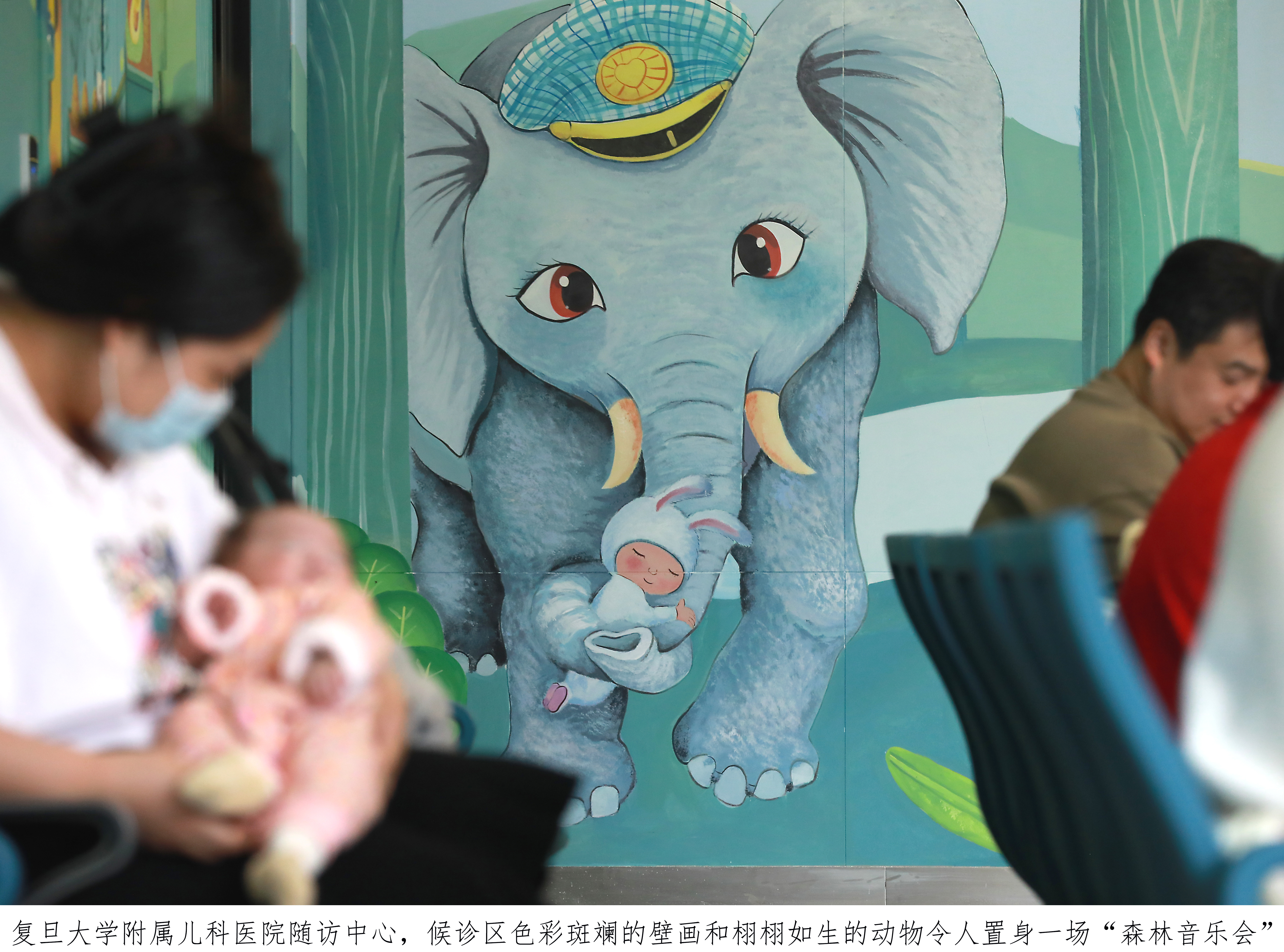 此外,随访中心在环境设计和空间布局上,无论是色彩选择还是区域划分,每一处细节都聚焦儿童的心理需求与家庭的情感体验,凸显了儿童友好医院建设的空间友好及服务友好理念。家长及宝宝走进随访中心,仿佛步入一个梦幻的“森林音乐会”,色彩斑斓的壁画和栩栩如生的动物形象,有可爱的宝宝趴在大象用鼻子蜷成的怀抱中熟睡、有融入“袋鼠式护理”照护理念的主题画作等,将原本素净的墙面打扮一新,令候诊区域仿佛置身于童话舞台。