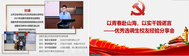 本次分享会特别邀请到学院硕士毕业生、2023年成都市紧缺专业选调生杜靖学长作主题分享。杜靖学长从“从复旦校园到天府乡村”“用镜头记录基层故事”“在民生小事中践行初心”三个方面,系统回顾了自己从青羊区委组织部到投资促进局、再到邛崃市大同镇孔家山村驻村工作的成长历程。他结合驻村实际,介绍了围绕青梅种植与深加工、中药材种植等特色产业发展情况,分享了如何在高海拔山区走遍十个村民小组、入户走访四百余户群众,在一次次登门交流中真正“走进群众家门、走进群众心门”。