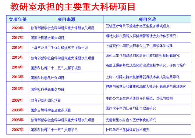 围绕国家需求和学术研究“顶天立地”的要求,教研室形成了卫生系统管理研究(涵盖体系、机制、制度等)和人群健康策略研究(涵盖全人群、重点人群,重点健康问题等)两个主要研究方向。